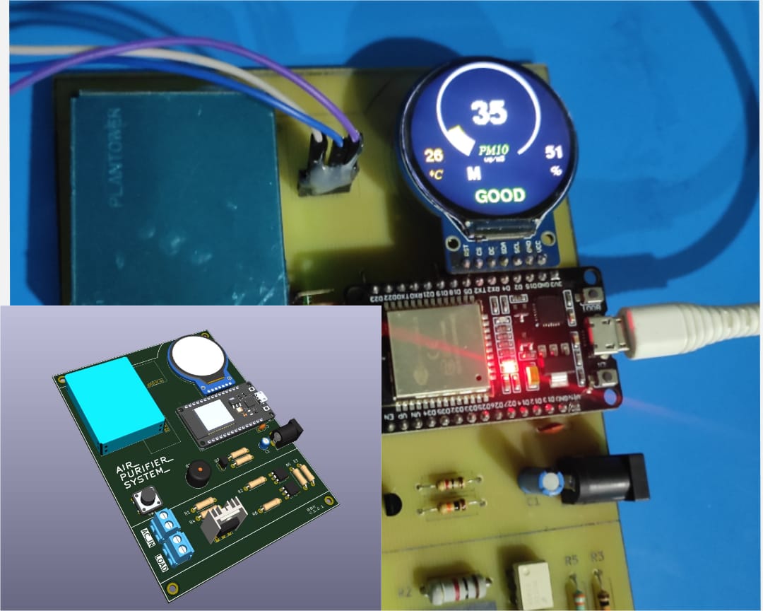 An air purifier system built with the PMS5003 PM2.5/PM10 sensor, HEPA filter, and AC fan, featuring an OLED display for real-time air quality, temperature, and humidity data. It supports automatic mode, which adjusts fan speed based on air quality, and manual mode, allowing speed control through a button.